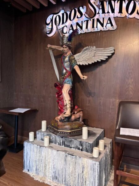 Para empezar, te recibe una estatua tamaño real de San Miguel Arcángel, imponente, acompañada de sus veladoras. Un símbolo de protección, fuerza y carácter que marca el tono del lugar.